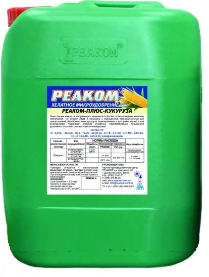 РЕАКОМ–ПЛЮС–КУКУРУДЗА – композиція мікро - і ультрамікрогетерогенність - елементів у формі різнолігандних хелатних комплексів на основі ОЕДФ і коламина з підвищеною проникністю для передпосівної обробки насіння кукурудзи (одночасно з протруйниками) та для позакореневого підживлення посівів кукурудзи, що сприяє підвищенню врожайності та якісних показників врожаю.