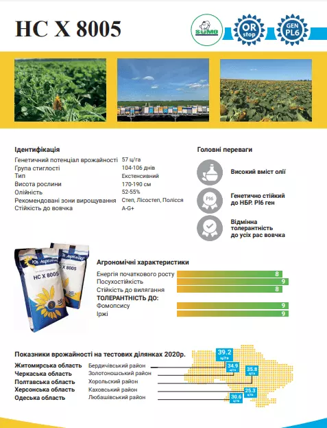 НСХ 8005 A-G+ — це ранньостиглий сербський гібрид соняшника із потенціалом врожайності до 5,7 т/га, призначений для вирощування за технологією Sumo (під гербіцид Гранстар). Має високу стійкість до 7+ рас вовчка, посухи, а також основних хвороб, таких як фомопсис і іржа. Завдяки потужній кореневій системі й високій олійності (52-55%), він є надійним варіантом для вирощування в зонах Полісся, Лісостепу та Степу України.